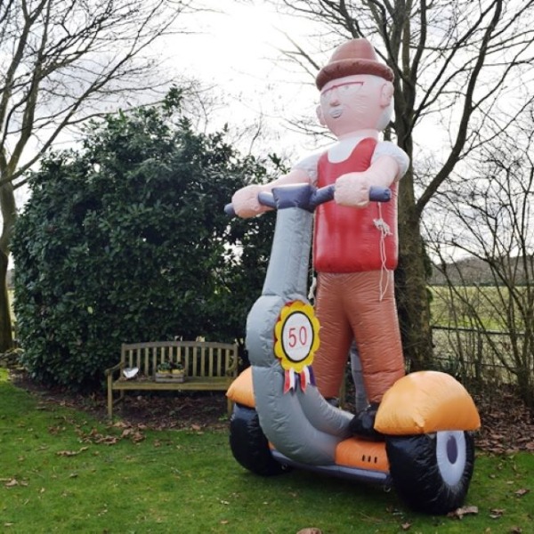 Je kent vast het bekende programma “Benidorm Bastards” wel. Nou, deze Abraham op Segway komt hier vandaan. Deze Abraham pop op Segway rijdt namelijk op een oranje Segway rond. Met zijn bruine hoedje en rode overhemd zal deze 3,80 meter hoge opblaaspop goed opvallen. Op de zijkant van de Segway kunnen we iedere leeftijd plaatsen. Zo is deze ludieke feestpop nu al een succes voor een halve Abraham. Maar natuurlijk zijn alle leeftijden mogelijk!