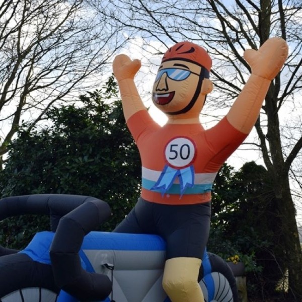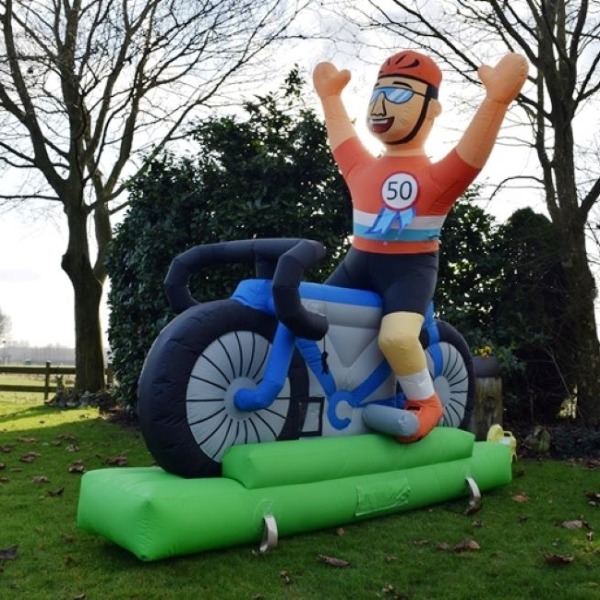 Is de jarige nog géén 50 jaar? Ook dan is deze opblaasbare wielrenner een leuke verrassing. We kunnen namelijk iedere leeftijd op zijn oranje t-shirt maken.