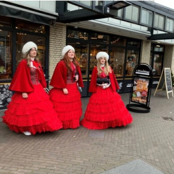 Christmas Carol Singers, echter dan in een eigentijds jasje. Niet alleen de kleding zal direct de aandacht trekken, ook de muzikale noten vliegen door de straten. De grootste en bekendste hits zullen voorbij komen waarbij stilstaan vaak onmogelijk gaan worden. Je bezoekers worden dan ook maar graag interactief meegenomen tijdens de muzikale klanken.