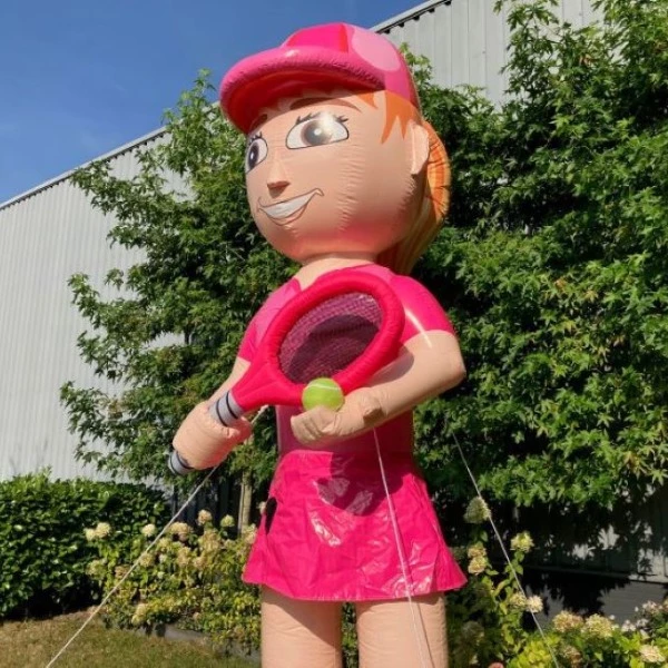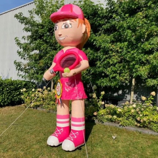 Een uniek exemplaar, dat is deze bijzondere Sarah pop tennisster. Deze opblaaspop is namelijk door ons creatieve team zelf getekend. Door de opvallende kleuren, duidelijke tennisracket en tennisbal valt deze Sarah pop zeker op in de straat. Op haar hoofd zit een mooie cap waaronder de mooie lange staart tevoorschijn komt.